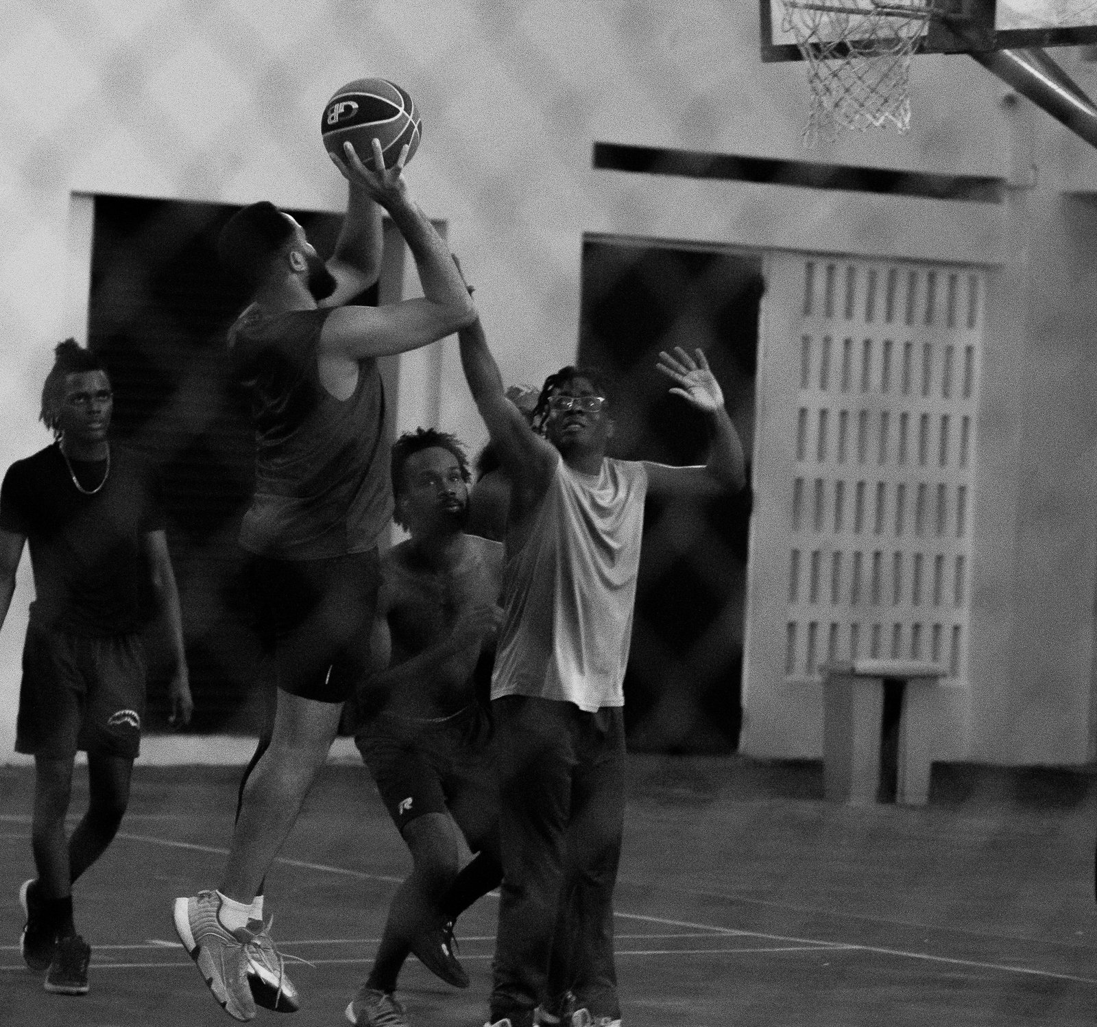 Four males play basketball on the UTech court, with one taking a shot at the hoop, on November 22.