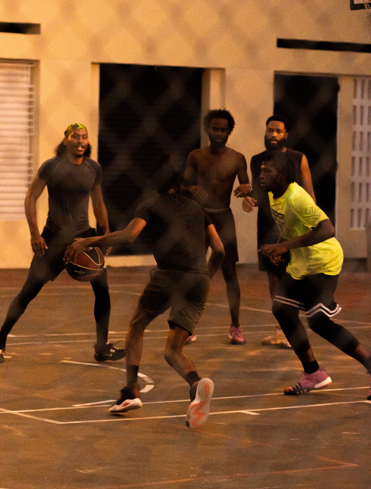 Four young men play basketball on a court at UTech on November 22, with one dribbling the ball as others hover nearby in a casual game.