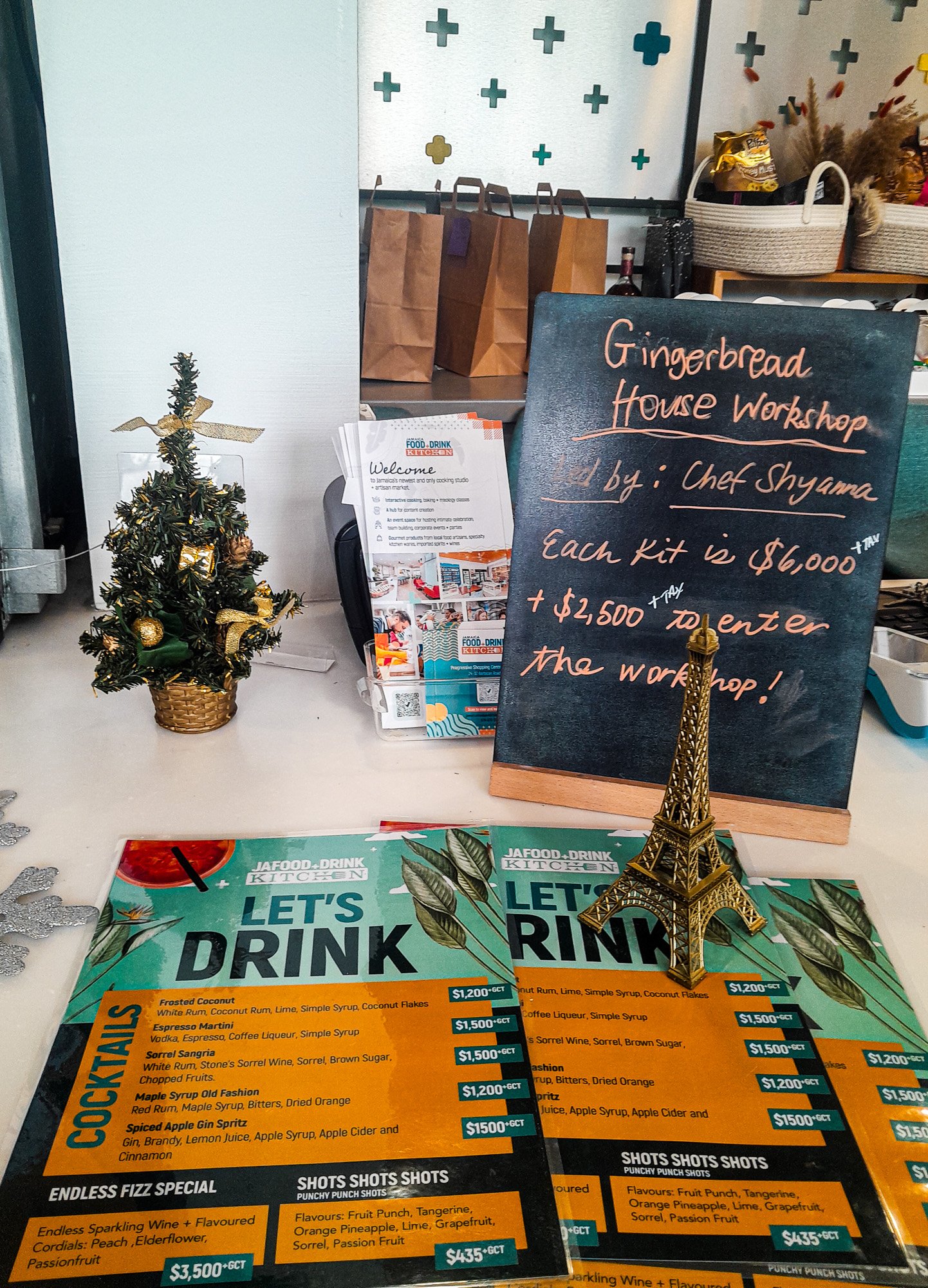 A mini chalkboard sign with details about a gingerbread house workshop sits on a table at the Sip, Taste & Shop Day Market at Jamaica Food and Drink Kitchen on December 13, inviting families to join the holiday activity.